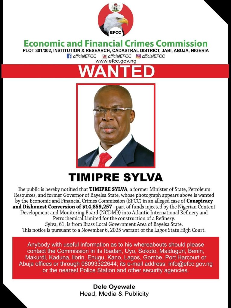 The Economic and Financial Crimes Commission (EFCC) has declared former Minister of State for Petroleum Resources and ex-Governor of Bayelsa State, Timipre Sylva, wanted for alleged involvement in a $14.8 million fraud.