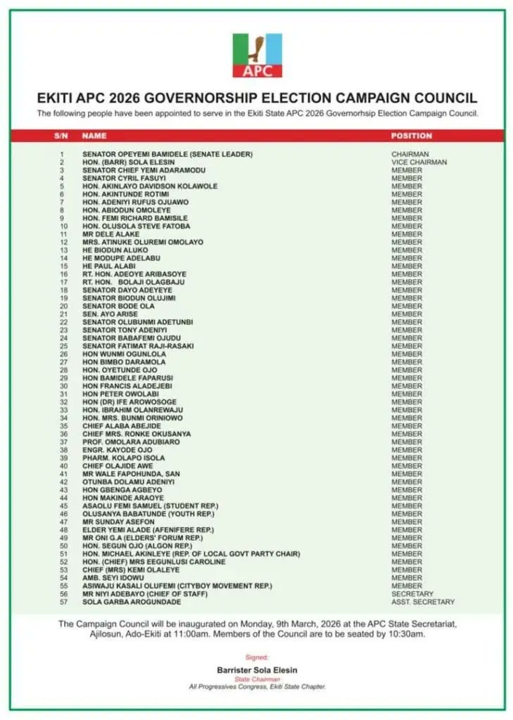 The Opeyemi Bamidele, Senate Leader, has been appointed to head the 57-member campaign council of the All Progressives Congress for the re-election bid of Biodun Oyebanji in the 2026 governorship election in Ekiti State.